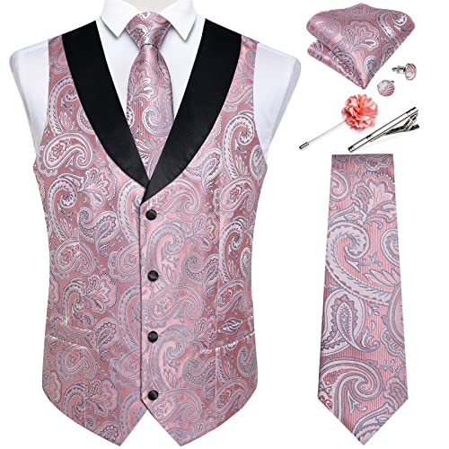 DiBanGu Mens Paisley Suit Vest Silk Jacquard Waistcoat and Necktie Set Formal Shawl Collar Dress Vest 7PCS for Wedding Party, Blush Pink, X-Large