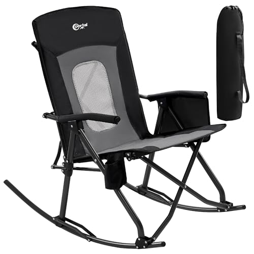 Portal Oversized Folding Rocking Camping Chair Portable Outdoor Rocker with High Back Hard Armrests Carry Bag, Supports 400 lbs, Mesh Back, Black & Grey