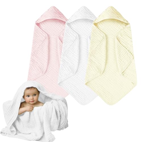 Momsnug Hooded Baby Towels, 3 Pack Muslin Cotton Baby Towel Set, Super Soft and Absorbent Bath Towel for Babies, Infant, Toddler and Kids, Newborn Essential (35 X 35 Inch) (White + Pink + Yellow)