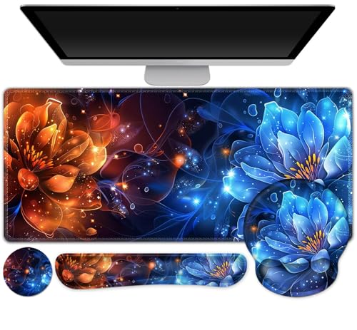 AIMSA Desk Mat Set, Large Gaming Mouse Pad with Wrist Rest, Ergonomic Mouse Pad and Keyboard Mat Wrist Support for Home Office Desk Accessories Decor -Fire and Ice Flower