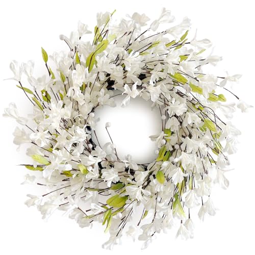24" White Christmas Wreath, Artificial Forsythia Wreath with White Berries, Winter Front Door Wreath for Farmhouse Indoor Outdoor Porch Window Decor