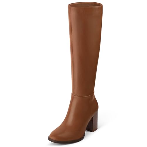 MUCCCUTE Brown Boots for Women Knee High - Chunky Heel Round Toe Pull On Tall Boots Long Leather Boot US Size 8