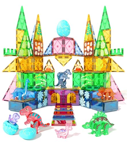 Asago Dinosaur Toys Magnetic Tiles Set - 2 Eggs, 2 Baby Dinos & 5 Large Dinosaurs for Kids 3-5, 105pcs Magnetic Building Blocks for Toddlers 1-3 4-8,Magnet Tiles Educational Toy for Boys Girls