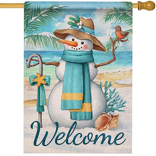 Hzppyz Welcome Winter Beach Snowman House Flag Double Sided, Sea Ocean Snow Coastal Decorative Garden Yard Outdoor Large Decor, Christmas Holiday Burlap Home Outside Decoration 28 x 40