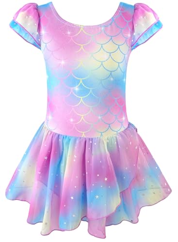 Gymnastics Leotards for Girls Ballet Dance Outfit 8 9 Toddler Leotard Tutu Dress Flutter Sleeves Rainbow Mermaid Ballerina Dancewear (Rainbow Mermaid, 8-9 Years)