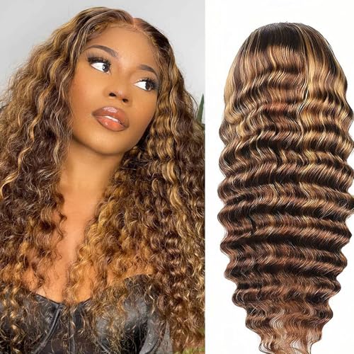 DULOVE Highlight Ombre Deep Wave Lace Front Wigs Human Hair Pre Plucked Glueless 13x4 Hd Lace Front Wigs Human Hair 4/27 Honey Blonde Lace Frontal Wig 200 Density 26inch