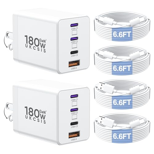2 Pack 180W USB C Charger Block, Foldable 4-Port GaN Super Fast Charger USB C, Dual 65W Type C Charging Block, Laptop Fast Charging Adapter for MacBook Pro/Air, iPad, iPhone, Samsung Galaxy (White)