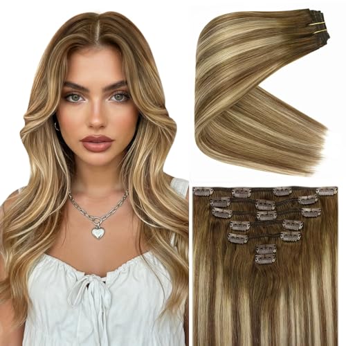Ve Sunny Clip in Hair Extensions Balayage Human Hair Clip in Extensions Ombre Chestnut Brown to Platinum Blonde Clip in Hair Extensions Real Human Hair for Holiday Party 120g 7pcs 16inch
