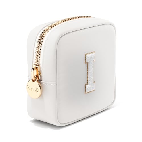Embla Preppy Makeup Bag Travel Cosmetic Pouch, Cute Make up Case with Personalized Initial, Girls Zipper Pouch Purse Cosmetics Organizer Tote, Waterproof Travel Skincare Makeup Bag, White (Letter I)