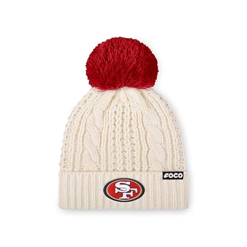 FOCO San Francisco 49ers NFL Womens Primary Logo Cable Knit Pom Beanie - White
