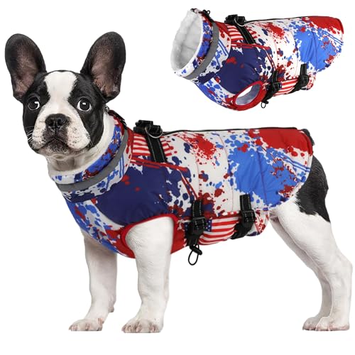 Mklhgty Dog Coat with Harness Built-in, Waterproof Reflective Fleece Lined - Warm Windproof Winter Jacket with Back Zipper, Cold Weather Snow Dog Coats - American Flag - L