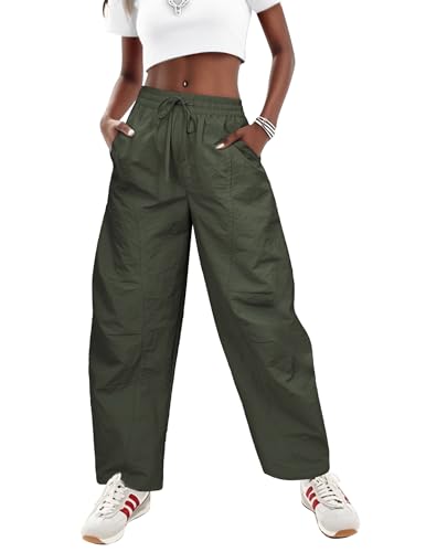LOOKBOHO Women's Parachute Cargo Pants - High Waist Wide Leg Baggy Casual Drawstring Lightweight Hiking Trouser Streetwear with Pockets Green Small