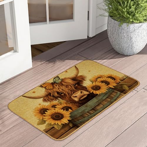 Door Mat Highland Cow Floor Door Mats,Sunflower Butterfly Washable Doormat for Front Porch Decor,Linen Welcome Mats Indoor Outdoor Rug for Farmhouse/Entryway/Home Entrance/Patio
