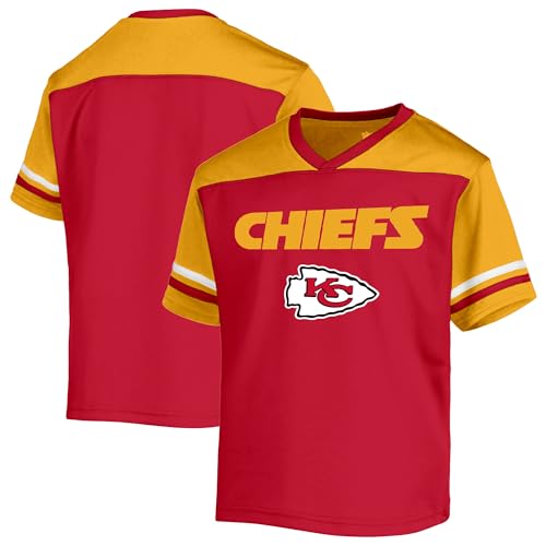 NFL Kids Youth 8-20 Officially Licensed Team Color Wordmark Primary Logo Victory Stripe V-Neck Jersey T-Shirt (Kansas City Chiefs Red, 18-20)