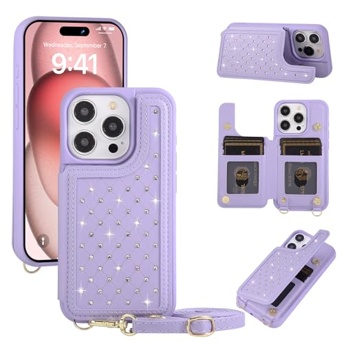 KYFSJPT Crossbody Wallet Case for iPhone 14 Pro Max(6.7") with Detachable Strap - PU Leather Flip Folio with Card Slots & RFID Blocking, Sparkling Diamond Accents-Purple