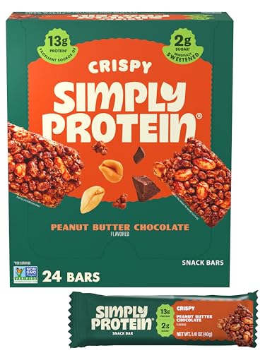 Simply Protein - Peanut Butter Chocolate Crispy Bars - Plant Based Protein Bars - Low Carb, Low Sugar, High Fiber - 13g Protein, 2g Sugar, 7g Fiber - Vegan, Gluten Free, Non GMO, Kosher - 24 Bars