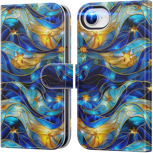 DEENAKIN for iPhone 16e Wallet Case with Card Holder + Cash Clip, RFID-Blocking, Military-Grade Drop Protection & UV-Printed Artwork, Magnetic Closure with Leather Kickstand - Bule Gold Water