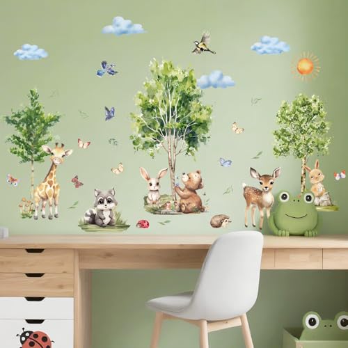 Forest Animals Wall Decals, Removable Wall Stickers with Giraffe, Bunny, Deer, Peel Stick Bear, Birds, Butterflies Vinyl Decals, Raccoon and Hedgehog Kids' Room Decor for Nursery, Playroom, Bedroom