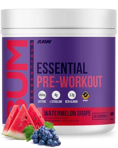 RAW Essential Pre-Workout Powder (Watermelon Grape) - Chris Bumstead Sports Nutrition Supplement for Men & Women - Preworkout Energy Powder with Caffeine, L-Citrulline, L-Tyrosine & Beta Alanine Blend