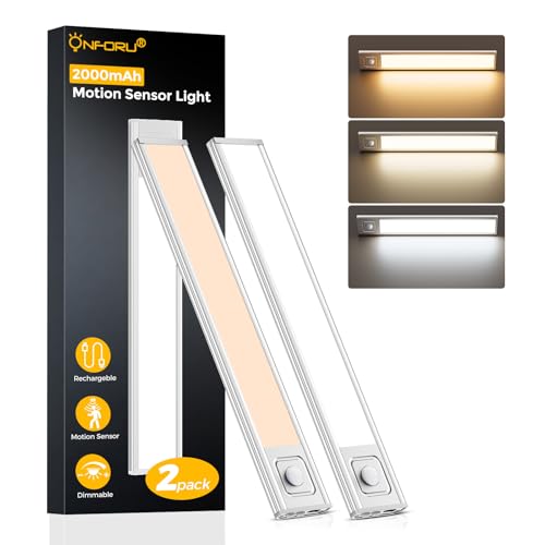 Onforu 9.8" Under Cabinet Lighting, 2000mAh USB-C Rechargeable, Motion Sensor Under Cabinet Lights with 3 Color & Dimmable, Magnetic Under Counter Lights for Kitchen, Closet, 2 Pack