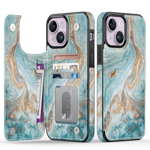 Goodon for iPhone 15 Plus Case Wallet - Flip Folio Leather Cover with Trendy Floral Design, 4 Card Slots & Kickstand Function, Stylish Protective Phone Case for Women and Girls - Teal Gold Marble