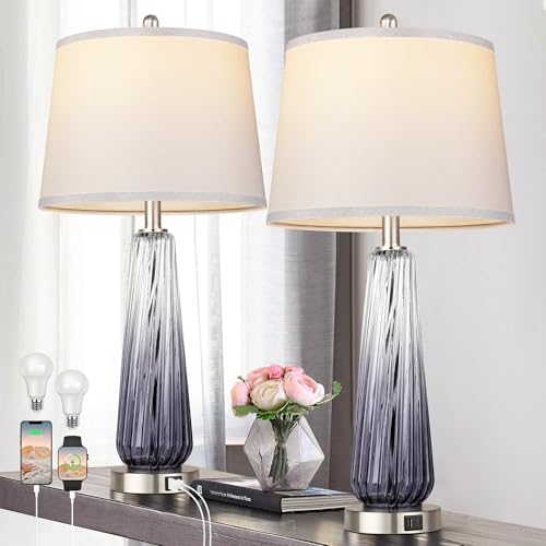 Glass Table Lamps Set of 2, Modern Bedside Lamps for Bedrooms with USB A+C Ports, 3-Way Dimmable Touch Control Nightstand Lamp with White Linen Shade, 27.5" Large Lamps for Living Room Decor, Grey