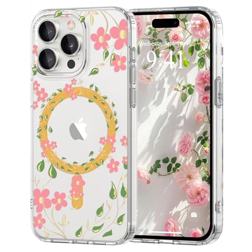 Pepmune Magnetic for iPhone 15 Pro Max Case Floral, Cute Luxury Clear Flower Cover for Women Girls Soft Elegant Plated [Compatible with Magsafe] Protective Phone Case for iPhone 15 Pro Max, Pink Petal