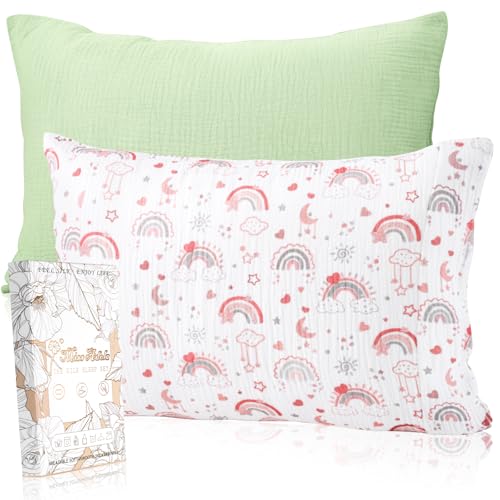Miss Adola Muslin Toddler Pillowcase Set of 2-13x18 Cotton Toddler Pillow Cases with Envelope Closure Cute Cartoon Soft Breathable Kids Pillowcases for Baby Boys Girls, Rainbow & Light Green