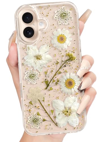 Loheckle for iPhone 16 Plus Case for Women - Girls Cute Glitter Dried Flower Floral Girly Aesthetic Kawaii Sparkle Sparkly Bling Unique Handmade Phone Cover for Apple 16 Plus 6.7", White