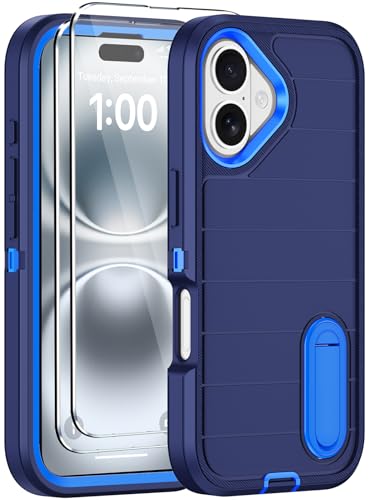 for iPhone 16 Case with Screen Protector, Heavy Duty Shockproof Drop Protection Military Grade Tri-Layer Full Covered Rugged Durable Cell Phone Cover with Built-in Invisible Kickstand 6.1" (Blue)