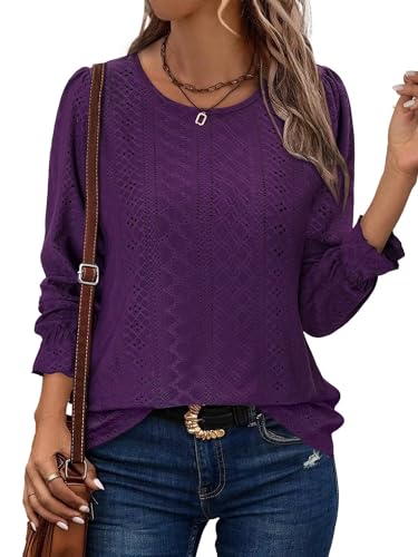 KISSMODA Women's Long Sleeve Blouses Casual Loose Fit Fall Fashion Clothes Crew Neck Party Shirt Plus Size Elegant Work Tunics Professional Purple Eyelet Top 2025 Fashion XL