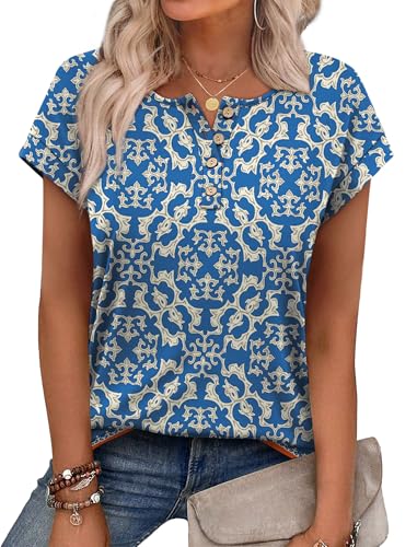 OFEEFAN Womens T Shirts Short Sleeve Boho Tops for Women Blouses Travel Outfits Spring Tops Dressy Casual Blue S