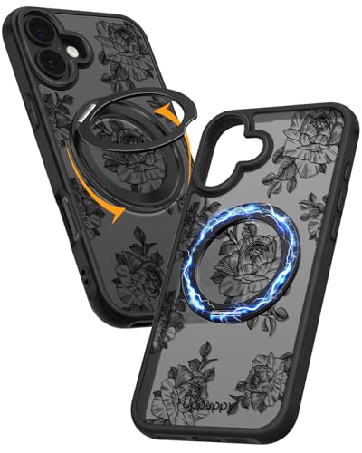 Uppuppy for iPhone 16 Plus Case with 360° Rotatable Magnetic Ring - Compatible with MagSafe, Semi-Transparent Soft-Touch Material Shockproof, Cute Line Art Flower Design for Women Girl