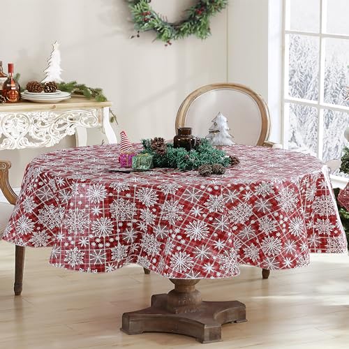 Newbridge Snowfall Snowflake Plaid Christmas Vinyl Tablecloth with Flannel Backing, Red, Wipe Clean Contemporary Snowflake Design, 60 x 84 Inch Oval