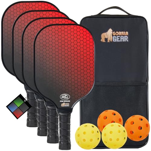 Gorilla Gear USAPA Approved Pickleball Paddles Set of 4, Indoor Fiberglass Shock Absorbent Racket with Comfortable Grip, Outdoor Pickle Ball Court Equipment, Sports Accessories Includes Bag, Red