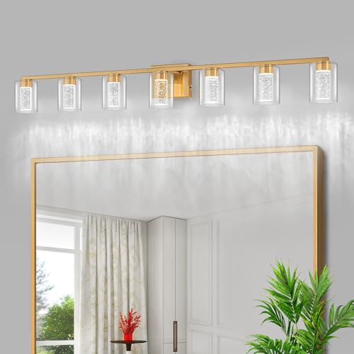 SineRise 7-Light Gold Vanity Light with 3 Color Modes (3000K/4000K/6000K), Eye Protection LED Bathroom Light Fixture, Dimmable Modern Wall Light Over Mirror with Clear Glass Shade