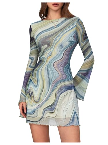 MakeMeChic Women's Cheetah Print Mini Dress Y2k Bell Sleeve Leopard Print Dress Going Out Outfits Tie Dye Green X-Small