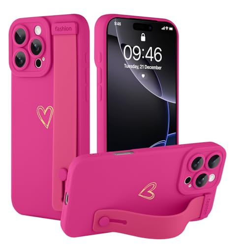 Ufbara Compatible with iPhone 16 Pro Max Case for Women Men, Cute Love Heart Pattern, Built in Adjustable Metal Wrist Strap Grip Hand Holder Kickstand Soft Silicone Cover, Hot Pink