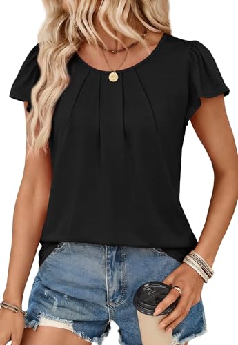 OFEEFAN Womens Tops Dressy Casual Pleated Ruffle Sleeve Beach Vacation Clothes Crew Neck Short Sleeve Shirts for Women Trendy Summer Outfits Work Blouse Summer Tops Black 2XL