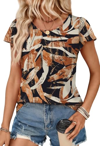 OFEEFAN Vacation Beach Blouse Women Floral Print Short Sleeve Dressy Casual Tops Lightweight Travel Shirts Summer Tropical Hawaiian Tunic Black-Orange Leaves M