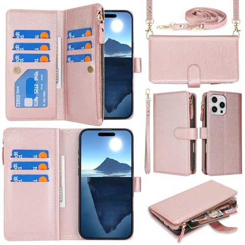 Jaorty Fit for iPhone 16 Pro 5G Phone Case Wallet for Women with Strap,Crossbody Shoulder Lanyard Wallet Case for iPhone 16 Pro with Card Holder,Zipper Pocket PU Leather Phone Case,6.3" Rosegold