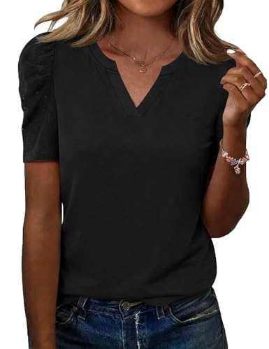 LOMON Black Top Womens Shirts Ladies Summer Tops Embroidered Lace Eyelet Tops Womens T Shirts Loose Fit V Neck Blouses Professional Clothes Black S