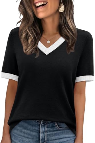 WIHOLL Womens Tops Short Sleeve Sweater Spring Summer Tops for Women 2026 Business Casual Outfits V Neck Work Teacher Clothing Ladies Blouses Beach Vacation Clothes 2025 2026 Black XL