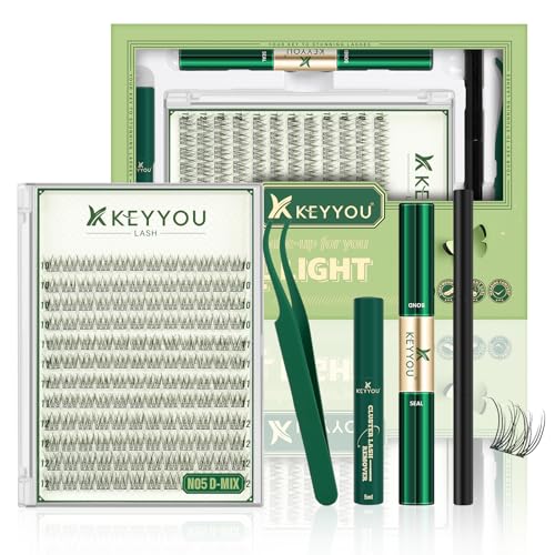KEYYOU Natural Lash Clusters Kit 144Pcs DIY Lash Extension Kit Wispy Eyelash Extensions Kit D Curl 10-12MIX with Bond and Seal and tweezers with Thin Lash Band(KIT-N05-D-10-12MIX)