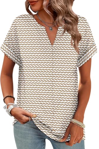 WIHOLL Tshirts Shirts for Women V Neck Short Sleeve Boho Tops Summer Outfits Business Casual Beach Fashion Travel Resort Wear Ladies Tops and Blouses Brown White S