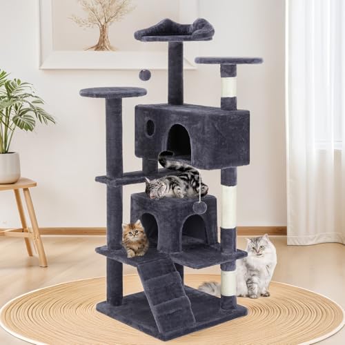 Sweetcrispy 54 Inch Cat Tree Tower, Multi-Level Tower with Cat Scratching Post, Indoor Cat Condo with Climbing Ladder, Plush Toy, Play House for Cat, Dark Grey