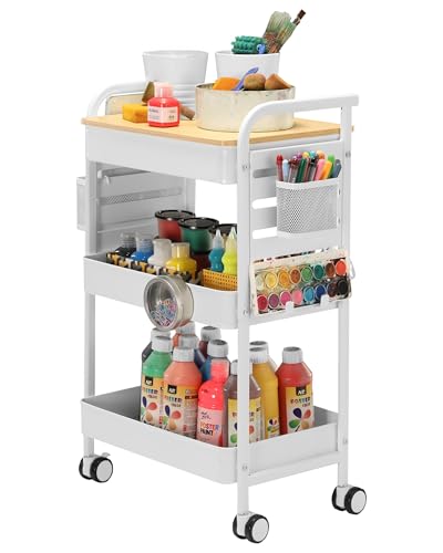 Art Cart with Tabletop & Pegboard - 3-Tier Rolling Utility Cart with Wheels, 2 Baskets & 6 Hooks - Metal Storage Organizer for Home, Office, Crafting & Kids’ Art Supplies (White)