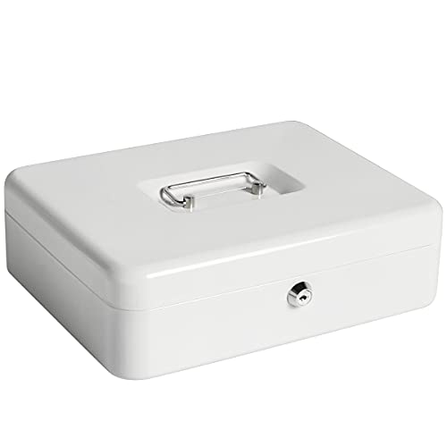 Cash Box with Money Tray and Key Lock, Parrency Large Money Box, 11 4/5" x 9 2/5" x 3 1/2", (XLarge with Key Lock White, XLarge)
