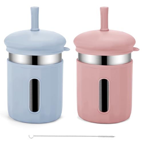 EsOfficce Stainless Steel Kids Cups, 12.51 oz Toddler Tumbler with Straws and Lids, Spill-Proof Baby Smoothie Cup with Silicone Sleeve, Versatile 2-in-1 Drinking Snack Cups for Kids (Blue+Coral)