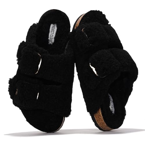 Project Cloud 100% Genuine Leather Flat Sandals for Women 2026 Comfortable Beach Essentials Womens Sandals Memory Foam Vacation Essentials Slides for Women Footwear (SantoriniFur,BLK,11)